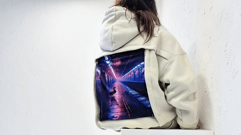 Each hoodie comes with two hidden side zippers and a top docking frame that securely holds your print in place. No tools, no complications — just a smooth, satisfying swap.